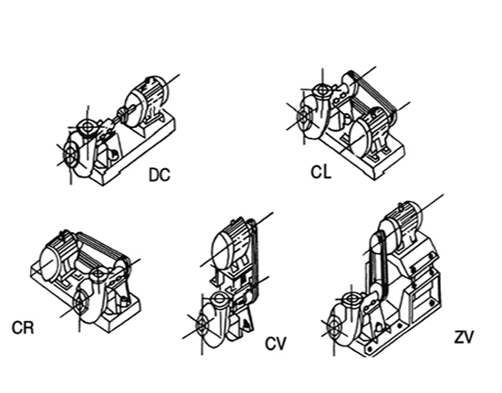 渣漿泵有多種安裝方式,泵的吐出口可沿鉛垂面旋轉安裝。傳動方式有彈性聯軸器方式傳動(DC傳動),